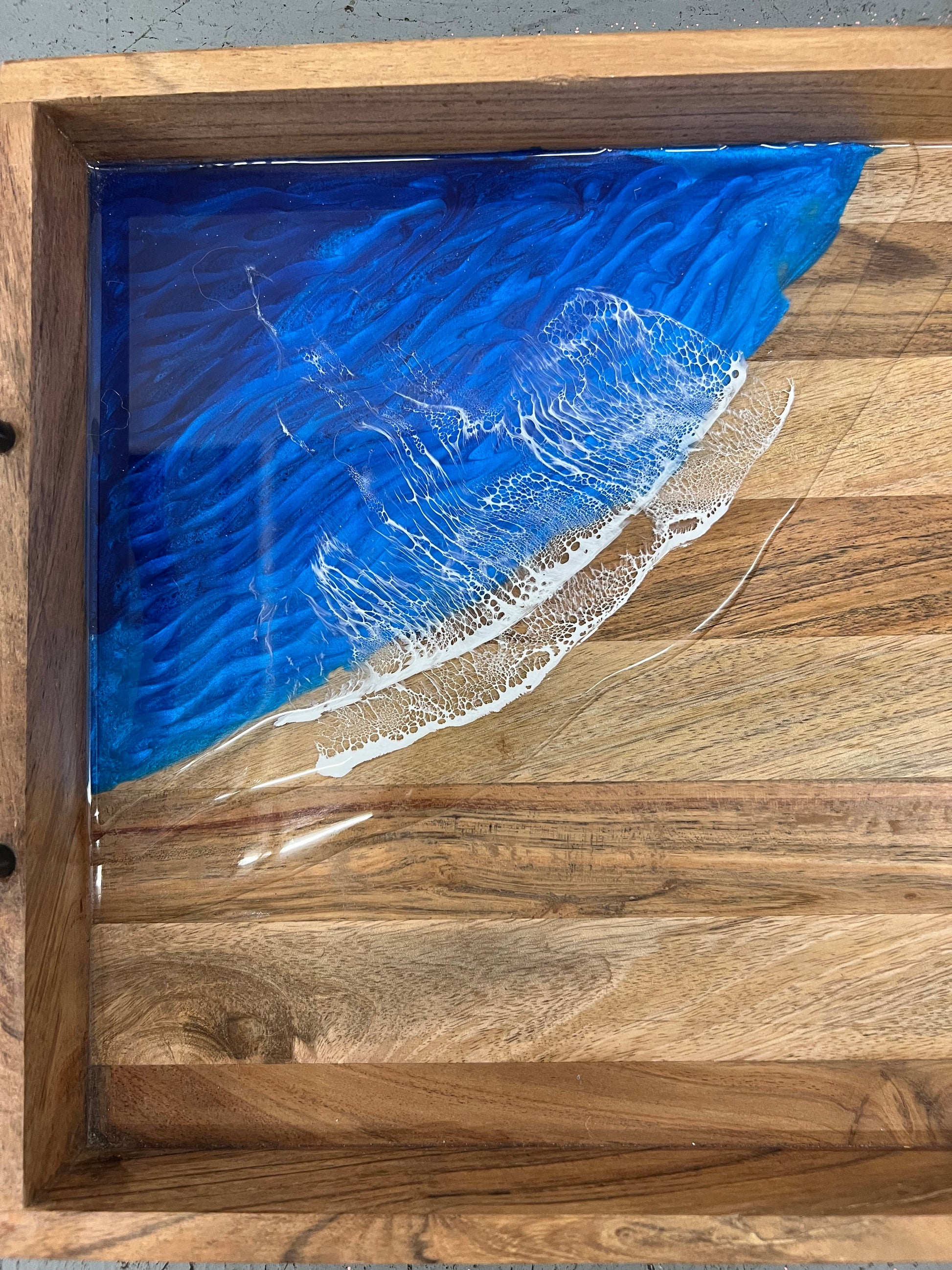 Wooden tray with ocean wave epoxy resin artwork.